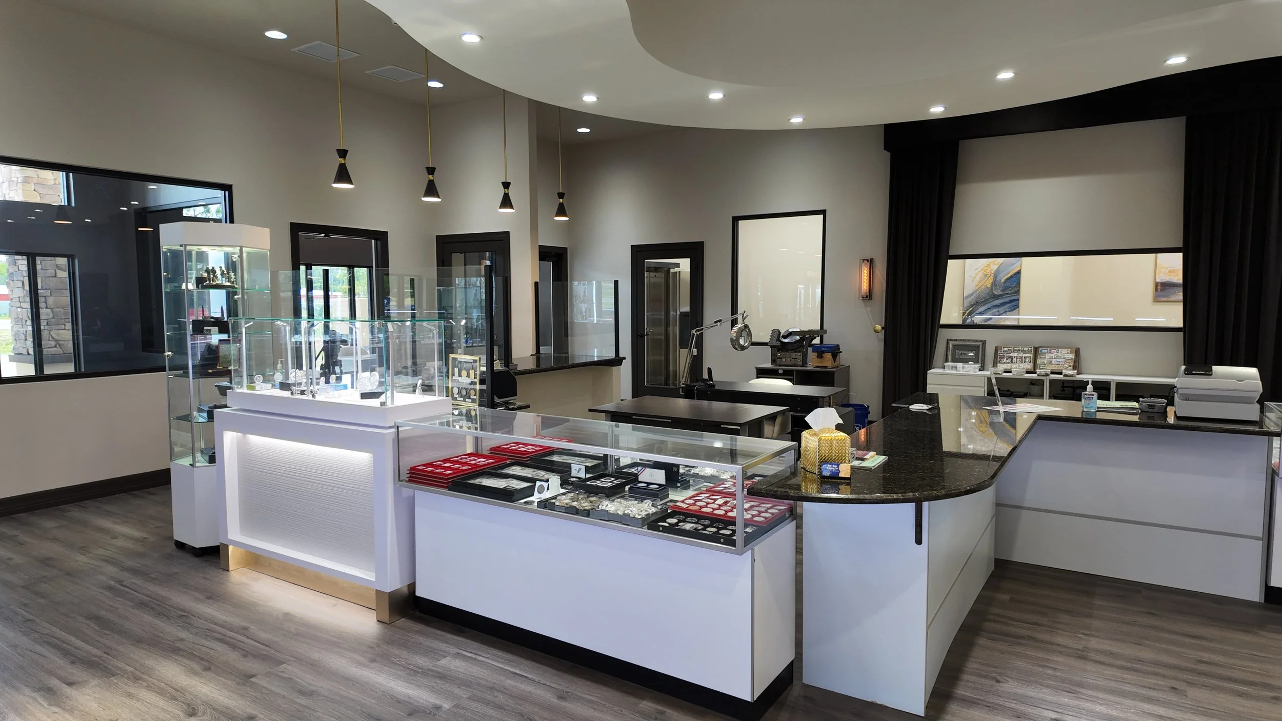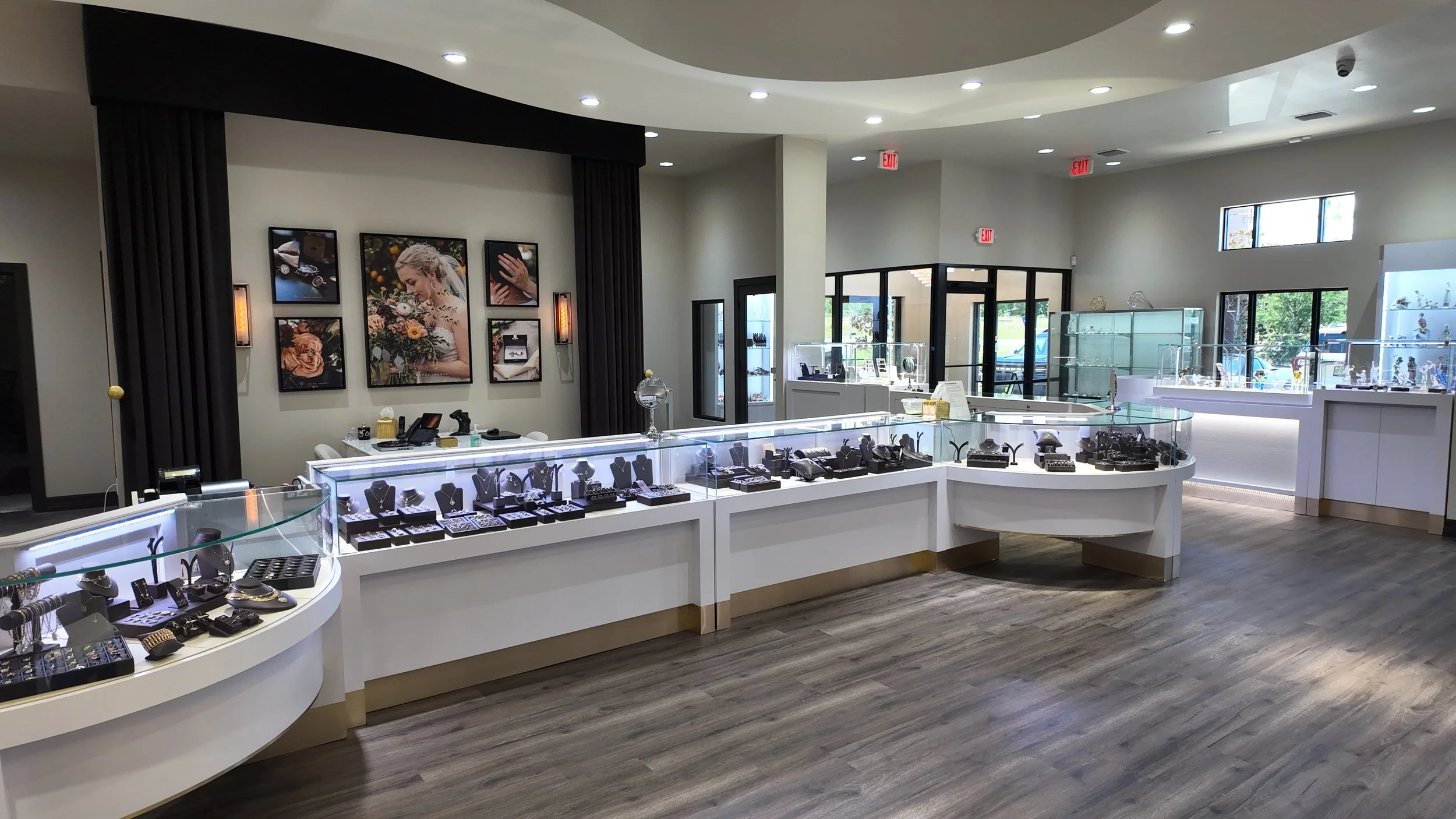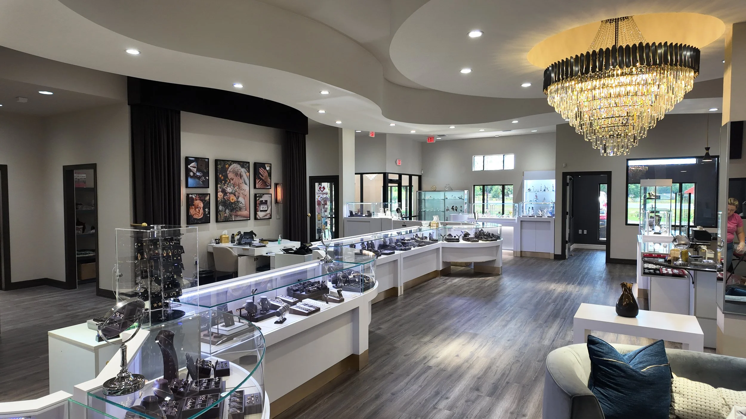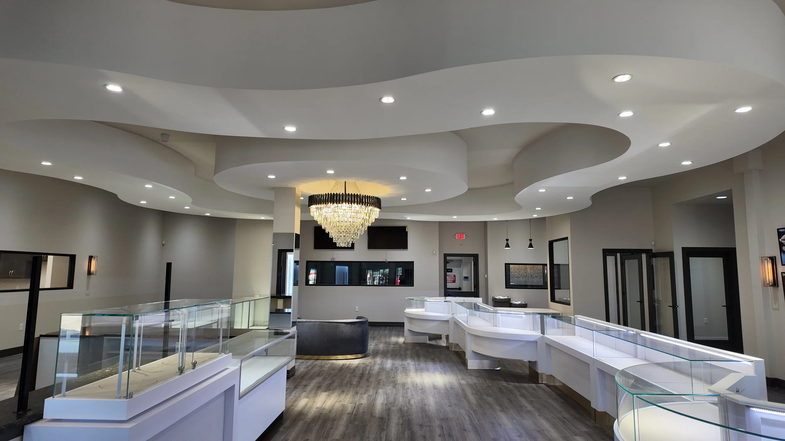 This newly constructed jewelry store in Summerfield, Florida showcases a carefully curated interior and exterior design. Ladesa masterfully blended modern and transitional elements to create a refined yet welcoming atmosphere that enhances the overall shopping experience. Thoughtful luxury details were incorporated throughout to echo the elegance of the jewelry on display. A custom-designed drop ceiling accent adds a striking focal point, further elevating the space into a polished and contemporary retail environment that feels both sophisticated and approachable.